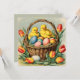 De mignons poussins de Pâques à l'ancienne sont assis dans un panier rempli d'oeufs et de tulipes vibrantes tout autour. Personnalisez l'autre côté de cette invitation avec les détails de votre fête.