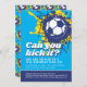 Peux-tu le frapper ? Football football ballon enfants sportifs invitations de fête en bleu clair, jaune, blanc et bleu foncé. Personnalisez avec vos propres détails de fête. Boule de football coloré allant dans le fond de l'art graphique et le design du net par www.mylittleeden.com sur éblouissant.