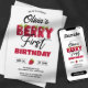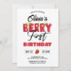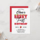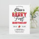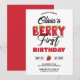 Célébrez le premier anniversaire d'un petit avec cette adorable invitation sur le thème de la fraise ! Avec des lettres de fraise mignonnes qui épellent "Berry First" et une illustration de petite fraise sucrée, cette invitation est parfaite pour une fête d'été.