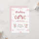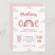 Invitation vos amis et proches à la fête de premier anniversaire de votre enfant rose pastel arc-en-ciel avec cette invitation fantaisiste embellie avec des nuages roses doux et un adorable arc-en-ciel en lettrage disant "un".