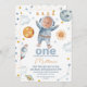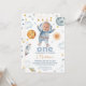 Premier voyage autour du Soleil QR Code 1er Anniversaire Invitation Sweet extérieur ou premier voyage autour du soleil première invitation pour un bébé garçon qui présente la photo de votre petit garçon dans le casque spatial. Ce premier voyage autour du soleil 1er anniversaire d'invitation comprend également, un petit soleil, planètes, étoiles, vaisseau spatial et vaisseau spatial. Un code QR remplaçable apparaît au verso de l'invitation.
