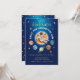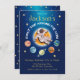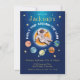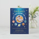 Célébrez le 1er anniversaire de votre fils ou de votre fille avec l'invitation thématique de l'espace. Dispose d'un astronaute tenant des planètes de ballons dans le ciel de l'espace avec des étoiles en faux or. Houston, nous avons un an, pour leur premier voyage autour de la formulation du soleil.