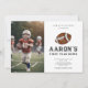 First Year Down Football Photo 1st Birthday Party Invitation Lancez le premier anniversaire de votre petit débutant en style avec cette première année Down 1st Birthday Party Invitation! Célébrez son statut exceptionnel de "Rookie de l'année" avec cet invitation sportif et au thème du football. Orné de teintes vertes et marron qui rappellent le terrain de football, il prépare le terrain à une fête animée. Rejoignez-nous au coup d'envoi pour une extravagance sportive qui promet plaisir, émotions et souvenirs abondants. Cette invitation personnalisée saisit l'essence d'un jeu de football américain, parfait pour la journée spéciale de votre petit garçon. Préparez-vous à marquer gros et faire de cette fête d'anniversaire un moment de toucher gagnant!