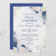 Cette invitation de Première Sainte Communion est une façon charmante d'inviter amis et famille à cet événement catholique spécial. Le mélange de jolies fleurs blanches et de fleurs bleues la rend idéale pour la célébration de la Première Communion d'un enfant.