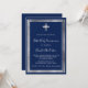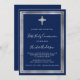 Une invitation moderne, élégante et raffinée. Un arrière - plan bleu marine décoré d'une croix, de faux cadres argentés. Personnalisez et ajoutez un nom et des détails. Texte blanc.