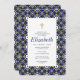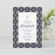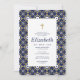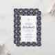 Composé de typographie serif et cursive. Le tout sur fond de tuiles méditerranéennes bleues et blanches
