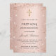 Un arrière - plan rose à l'apparence métallique. Décoré d'or rose, de poussière de parties scintillant rose et d'une croix. Personnalisez et ajoutez un nom et des détails. Le nom est écrit avec un script de style manuscrit