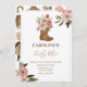 Le "Little Cowgirl First Rodeo 1st Birthday Invitation" est un produit conçu pour les invités invitations à une fête d'anniversaire pour une jeune fille qui a un an. L'invitation présente un design de style occidental, avec un casquette et des bottes de petite cowgirl mignonnes, ainsi qu'une palette de couleurs rose et marron.