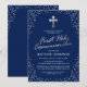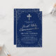 Invitation pour la première communion d'un garçon avec un fond bleu marine pouvant être modifié à souhait, des paillettes argentées élégamment dispersées, un titre en argent à l'aspect métallisé, une croix religieuse et un modèle de communion facile à personnaliser.