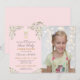 Elégante invitation florale de la Première Sainte Communion avec un charme rustique et d'inspiration vintage y compris le chalice. Le dos présente une croix de style boho ornée de délicates fleurs d'aquarelle et d'une végétation luxuriante. Personnalisez avec votre propre photo et customisez le texte pour convenir à un baptême ou un baptême, le rendant parfait pour votre occasion spéciale.