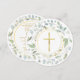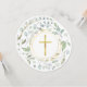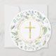 Une couronne de laurier décorative et des anneaux dorés entourent les informations de votre invitation spéciale de première sainte communion sur ce design élégant.