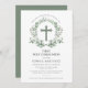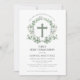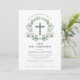 Choix élégant pour une invitation à la première communion de fille. Une couronne d'eucalyptus vert sauge encadre une simple croix en haut. Tout le texte peut être modifié.