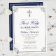 Premières cartes d'invitation de la Sainte Communion avec une Croix et beau cadre tissé dans les tons d'argent. La typographie de la carte présente une fusion de caligraphie élégante et de texte minimaliste moderne dans des tons gris argenté et bleu marine. L'avant de la carte est blanc tandis que l'arrière est bleu marine avec Croix et cadre. Disponible en version imprimée ou téléchargeable de haute qualité, offrant un format de téléchargement numérique instantané pour les messages texte, e-mail ou les messages sur les médias sociaux.