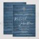 Une invitation de première communion rustique avec une croix dorée élégante et le nom en écriture sur un fond de panneaux de bois bleu. Personnalisez avec les informations de votre événement spécial dans une typographie chic. Conçu par Thisisnotme©