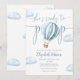 Cette invitation à une baby shower charmante présente un ballon à air chaud bleu mignon et des nuages, ainsi qu'une typographie élégante. Conçue par Thisisnotme©