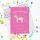 Quand elle veut une fête d'anniversaire à thème de la licorne, vous lui donnez une célébration de thème de la licorne. Cette invitation à la fête d'anniversaire, rose bonbon, chéri, illustrée, présente une licorne texturale, rose vif illustrée, avec une jolie crinière arc-en-ciel pastel et des poils de queue entourée d'une dispersion de coeurs et de scintillement magique. Le texte de l'invitation de cet enfant est facile à personnaliser, y compris le texte du script arché pour son nom et son âge. Le support correspondant a un motif de coeurs à égaler.
