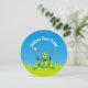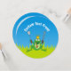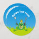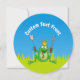 Grenouille Prince avec outils barbecue, tongs et spatule sur herbe verte sous ciel bleu.