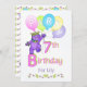 Invitation personnalisée à l'occasion de la fête du 7e anniversaire avec une princesse en peluche mignonne et mignonne, en peluche, vêtue d'une belle couronne jaune ornée de bijoux et d'accessoires de fleurs roses, bleues et vertes portant un tas de ballons avec le mot "PARTY" sur eux. Personnaliser avec le nom de l'enfant en fait un endroit spécial. Design original par Anura Design Studio.