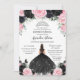 Personnalisez cette belle invitation quinceañera en argent floral noir et rose avec votre propre libellé facilement et rapidement. Cliquez sur le bouton Modifier à l'aide des outils de conception pour modifier davantage le texte, le libellé, le style de police, la taille de police, la couleur de police, ajouter du texte, déplacer ou supprimer des images. Le papillon, la coince fille et la couronne sont mobiles, redimensionnables, multipliables et amovibles. Objets correspondants disponibles en magasin ! c) Le Happy Cat Studio
