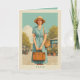 Illustration de charme à la vintage d'une femme en robe bleu pois et casquette solaire, tenant une valise en cuir dans une rue pavée parisienne, entourée de fleurs en fleurs et de vitrines classiques.