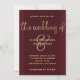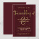 Cette faire-part de mariage étonnante est ornée d'un arrière - plan bordeaux avec des bordures plus légères assorties aux couleurs du vin, et d'une typographie manuscrite de script en faux or moderne. Un look simple et contemporain avec une esperluette fleurie et texte assorti audacieux.