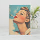 Un poster vintage de style années 1950 impressionnant avec une femme glamour aux lèvres rouges audacieuses et maquillage impeccable, fumant sensuellement une cigarette. La fumée douce bouillonne autour d'elle, dressée contre un arrière - plan bleu onirique qui capte l'allure et l'élégance de la publicité rétro.