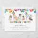 Invitations de fête d'anniversaire à thème pour chien amusant avec des illustrations de diverses races de chiens et des ballons de fête. L'envers a un motif d'empreinte bleu ciel. Personnalisez avec les détails de votre fête.