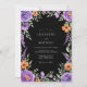This design features a striking black backdrop that allows the vibrant floral arrangement to pop. Rich purple roses and delicate lavender sprigs are paired with bright orange blossoms and lush green leaves. The mood is dramatic and sophisticated, perfect for an evening event. The watercolor style adds a touch of artistic elegance to the botanical border.