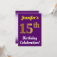 Ce design d’invitation à la fête d’anniversaire comporte un message comme "15e anniversaire de Jennifer!", où le nom peut être customisé, et où le numéro "15e" a un faux aspect doré. Il est également décoré d'un arrière - plan violet. Les détails de l'événement sur le dos peuvent être customisés. Il pourrait être utilisé pour invitation des gens à la fête du quinzième anniversaire ou à la fête d’anniversaire de quelqu’un. [~Z0000121]