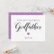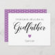 Demandez à cet homme spécial de votre vie d'être le parrain de votre enfant avec cette carte personnalisée de proposition de parrain. Ce design présente un petit coeur violet et des pois blancs sur le pourpre au dos.Customisez cette carte mignonne avec son nom et le nom de votre enfant.