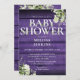 Une élégante invitation au baby shower avec une typographie élégante et une jolie végétation botanique sur un arrière - plan rustique en bois violet. Conçu par Thisisnotme©