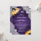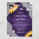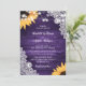 Elégante faire-part de mariage rustique violet avec tournesol et dentelle blanche fleurie sur un arrière - plan en bois de grange. Deux coeurs de burlap à l'arrière.