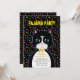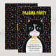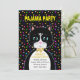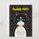 Carte d'invitation d'anniversaire pyjama avec un charmant chat smoking comme messager et des confettis colorés sur fond noir. Tout le texte est prêt à être personnalisé.