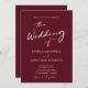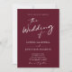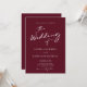 Tout en un QR Code RSVP Chic Moderne Calligraphie Blanche Script Burgundy Faire-part de mariage... Notre faire-part de mariage minimaliste à la mode bordeaux et blanc présente un script de calligraphie moderne combiné à un texte serif et sans serif pour un faire-part de mariage simple et chic. Le verso de l'invitation affiche également votre code QR de site Web mariage ainsi que l'URL du site lui-même permettant à vos invités de facilement RSVP en ligne et de voir tous les détails normalement envoyés dans un paquet mariage. L'exemple de modèle graphique de code QR et tous les exemples de texte (mis à part les éléments de calligraphie graphique) peuvent être facilement révisés avec vos propres informations sur le modèle de personnalisation.