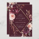 Ce faire-part de mariage est doté d'une couronne de fleurs d'aquarelle de dahlias, de roses de jardin et de pivoines en rouge bordeaux, marron, et rose roux sur les feuilles d'automne avec un cadre en diamant faux or et détails mariages, code QR lien site Web sur le dos. Pour une personnalisation plus avancée de cette conception, cliquez sur le BOUTON OUTIL DESIGN BLEU. Des articles correspondants sont également disponibles.