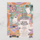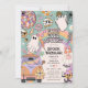Retro Four Ever Éffrayant Halloween 4th Birthday Party Invitation - Soyons Super ! Le design comprend un arrière - plan coloré avec un arc-en-ciel boho. Des illustrations cool rétro décorent le modèle simple avec d'adorables fantômes hippies, des fleurs de crâne, une boule de disco éffrayante et des bonbons spooktaculaires.