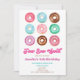C'est un Invitation Four Ever Sweet 4th Birthday avec un beignet et des arrosages thème. Le design se compose de beignes avec du gel et des arrosages au chocolat bleu, rose, violet, vert et marron. Fait pour un quatrième anniversaire !