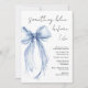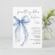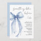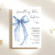 Invitation à la douche nuptiale chic avec une délicate aquarelle bleu clair coquette arc, "quelque chose de blu avant moi" dans un script de calligraphie moderne, et le nom de la mariée et les détails de la douche en lettres simples.