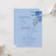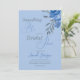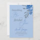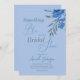 Élégant script de calligraphie Quelque chose de Fête des mariées Bleu Thème Invitation avec fleurs d'aquarelle. De l'autre côté, on trouve des verres de champagne avec un bouquet.