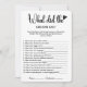 Qu'est-ce que le Groom a dit ? Jeu Fête des mariées | Elégante invitation de douche de mariage Apportez le rire, l'amour et quelques surprises à votre célébration avec notre Que la salle a dit? Jeu Fête des mariées | Elegant Wedding Shower Invitation — une activité hilarante et charmante qui permet aux invités de découvrir à quel point la mariée connaît son époux. Doté d'une calligraphie moderne, de fleurs d'aquarelle douce et d'une disposition épurée et minimaliste, ce jeu allie charme et plaisir en un moment de douche nuptiale inoubliable. Parfait pour les douches nuptiales, les fêtes de bachelorette, les wedding showers, ou même les brunchs et les bulles, ce jeu demande à la mariée de deviner comment son marié a répondu à une série de questions amusantes et personnelles — comme "Quel est son repas préféré ?" ou "Quel était leur premier rendez-vous ?" Les clients aimeront entendre ses réponses et ses réponses réelles ! Vous pouvez customiser cette carte avec le nom de la mariée, la date de l’événement, et faire correspondre le design à votre thème : verdure botanique, jardin fleur sauvage, quelque chose de bleu, ou rustique moderne. C’est un ajout fantastique à un ensemble de jeux, à une table d’accueil ou à un lieu d’hébergement. Imprimée sur des cartons de qualité supérieure, cette activité est parfaite pour des célébrations en personne ou virtuelles et fait un souvenir mémorable pour la mariée. 🖤 Cliquez sur Personnaliser maintenant pour concevoir votre jeu What Do the Groom Say Game et créer une douche nuptiale remplie de joie, de rire et d'amour. ce que le marié a dit jeu, élégante activité douche nuptiale, jeu de devinette nuptiale imprimable, jeu wedding shower moderne, jeu nuptiale floral, calligraphie carte de jeu nuptiale, jeu de douche nuptiale minimaliste, triom amusant via des questions
