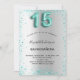 Une invitation moderne, élégante et glamour pour une Quinceañera fille, 15e anniversaire fête. Un arrière - plan à l'aspect faux argent, décoré de poussière de parties scintillant de couleur turquoise. Personnalisez et ajoutez votre nom et les détails de votre fête. Le numéro 15 est écrit avec une police de style ballon, script.