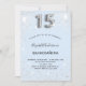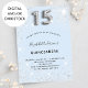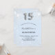 Une invitation moderne, élégante et glamour pour une Quinceañera fille, 15e anniversaire fête. Un arrière - plan bleu bébé, décoré avec de la poussière de parties scintillant fausse argent. Personnalisez et ajoutez votre nom et les détails de votre fête. Le numéro 15 est écrit avec une police de style ballon, script.