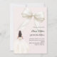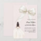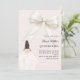 This sophisticated design features a large ivory bow adorned with delicate pearl details, paired with a graceful gown illustration. A soft blush pink colored background.