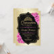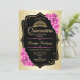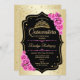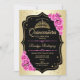 Invitation à la célébration de Quinceanera en or noir rose. Caractéristiques police script, rose pastel roses, tiara et confetti. Design rose vif et élégant avec de l'or de parties scintillant imitation. Parfait pour une élégante célébration de glamour.