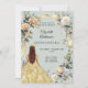 Un arrière - plan vert sage. Décoré de fleurs blanches et jaunes, vert sauge et ruban doré. Une fille portant une tiare et une robe. Personnalisez et ajoutez un nom et des détails.