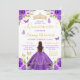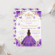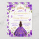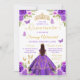 Celebrate her milestone in style with this elegant Quinceañera invitation featuring a girl in a sparkling purple ball gown, viewed gracefully from the back. Surrounded by soft florals, fluttering butterflies, and a regal golden crown, the design blends youthful charm with royal sophistication. The color palette includes royal purple, shimmering gold, and soft leafy greens—perfect for spring or summer celebrations. Ideal for princess-themed parties, this invitation sets a magical tone for an unforgettable evening.