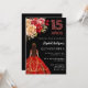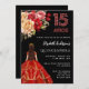 Une invitation moderne, élégante et glamour pour une Quinceañera, 15ème anniversaire. Un arrière - plan noir, une fille portant une robe rouge et or et des roses rouges, roses et dorés, des fleurs. Le nom est écrit avec un script de style moderne écrit à la main. Personnalisez et ajoutez les détails de votre fête.