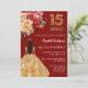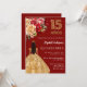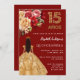 Une invitation moderne, élégante et glamour pour une Quinceañera, 15ème anniversaire. Un arrière - plan rouge, une fille portant une robe dorée et des roses rouges, roses et dorés, des fleurs. Le nom est écrit avec un script de style moderne écrit à la main. Personnalisez et ajoutez les détails de votre fête.