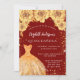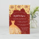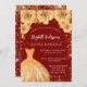 Une invitation moderne, élégante et glamour pour une Quinceañera, 15ème anniversaire. Un arrière - plan rouge avec de la poussière de parties scintillant faux or, une robe et des roses dorés, des fleurs. Le nom est écrit avec un script de style moderne écrit à la main. Personnalisez et ajoutez les détails de votre fête.