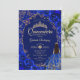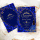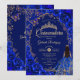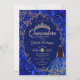 Invitation à la célébration de la Quinceanera en bleu et or royal. En vedette brune fille en robe de robe de bal, police de script, papillons d'or, roses d'aquarelle et tiara. Parfait pour une élégante célébration de glamour de style princesse. Personnalisez avec vos propres détails. Invitations Zazzle imprimées ou téléchargement instantané modèle imprimable numérique.
